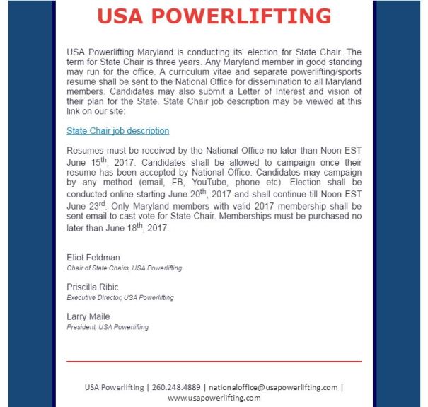 USA POWERLIFTING ONLINE LIABILITY WAIVER: EVERYONE ASSOCIATED WITH THIS MEET IS REQUIRED TO COMPLETE THIS WAIVER. YOU CAN SEND ME AN EMAIL PRIOR TO THE MEET AS PROOF THAT YOU HAVE COMPLETED THIS FORM. THE LINK CAN BE FOUND HERE. PLEASE NOTE THE NAME OF THE MEET AS “USA POWERLIFTING MARYLAND BENCH OPEN”.